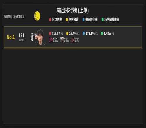 分均伤害、伤害占比、场均团战伤害zeus全部第一,伤害转化率zeus第二;