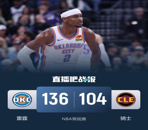 一开场,双方短暂相持,雷霆持续发力打出18-6的攻势获得两位数领先,亚历山大得分助攻一肩挑,骑士连投带罚予以回应,次节雷霆延续火力,多特内外开花帮助球队打出12-2的攻击波再度获得两位数优势,亚历山大稳定输出,半场战罢雷霆66-51领先骑士。下半场,骑士不断冲击内线展开反击,一度将分差迫近到个位数,亚历山大连投带罚稳住局势,末节霍姆格伦内外开花连得8分扩大优势,骑士努力追赶,随后雷霆狂轰滥炸连中7记三分,以136-104大胜骑士。